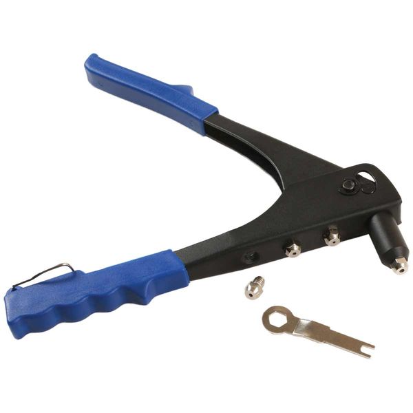 Standard riveter for aluminium and steel rivets, supplied complete with 4 heads and 30 assorted rivets to suit. This hand riveter tool is suitable for one handed operation, with an ergonomic grip handle with lock for when tool is not in use.