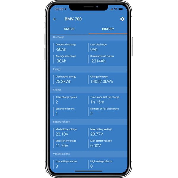 Next to the basic display options, such as voltage, current and ampere-hours consumed, the BMV-702 series also displays state of charge, time to go, and power consumption in Watts.